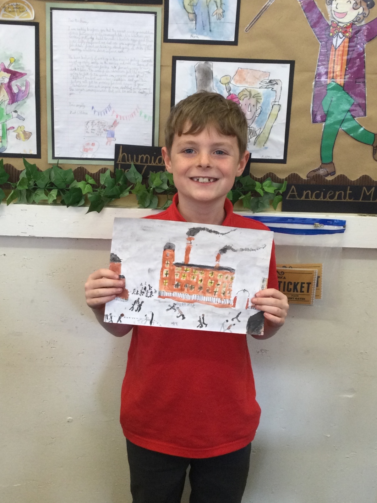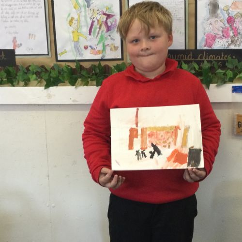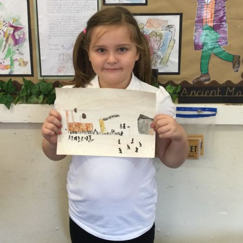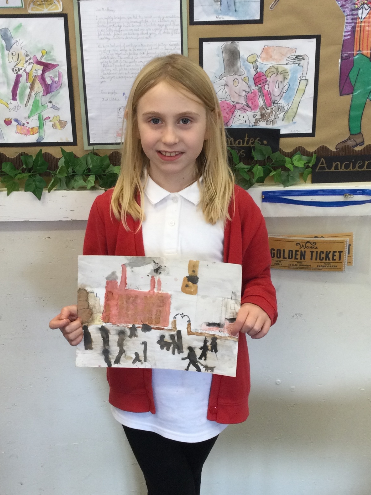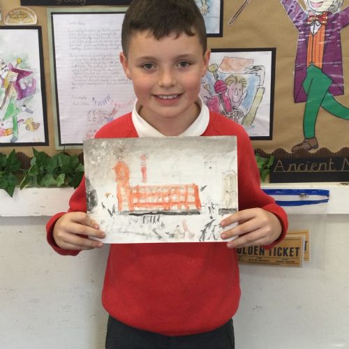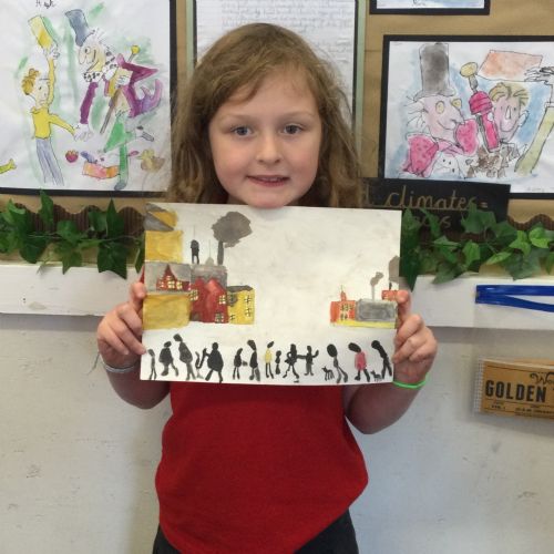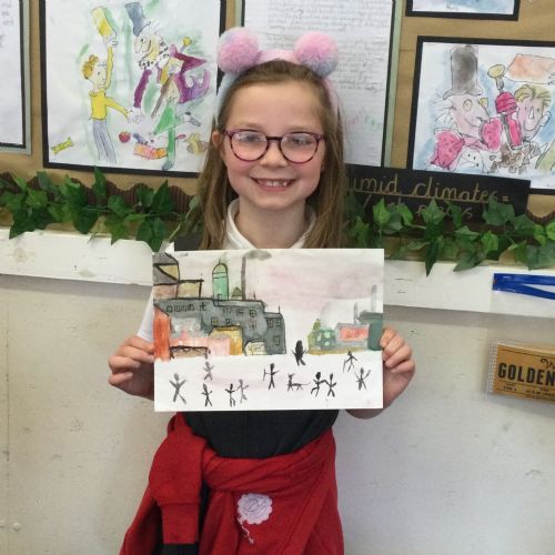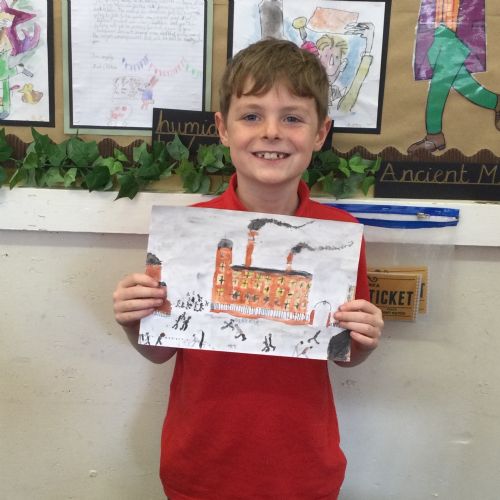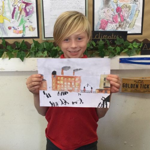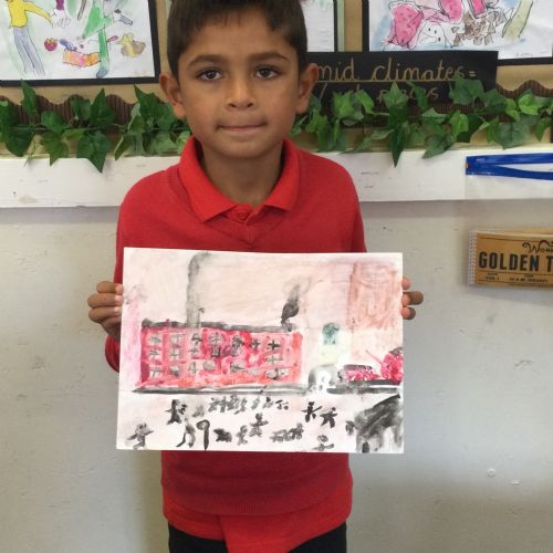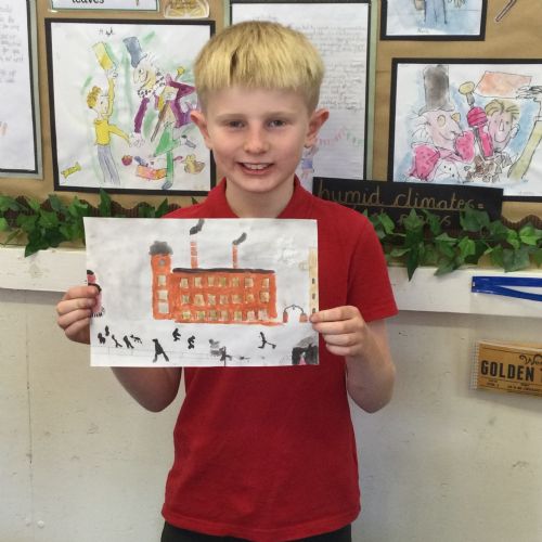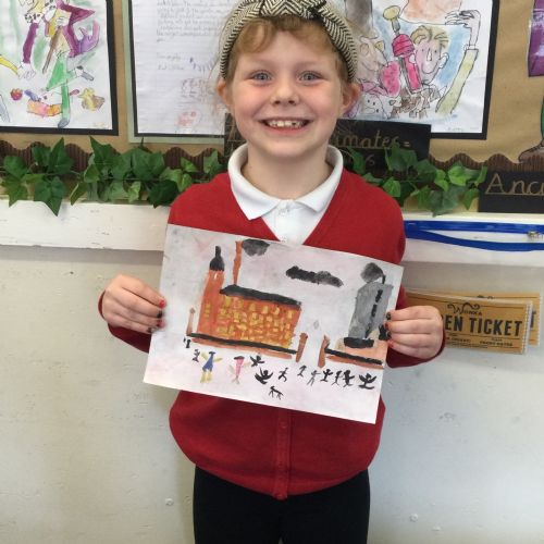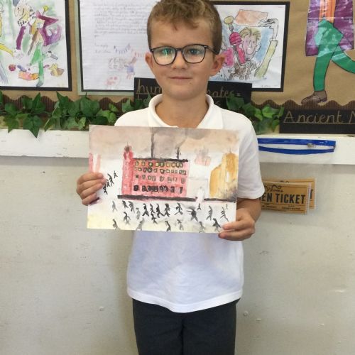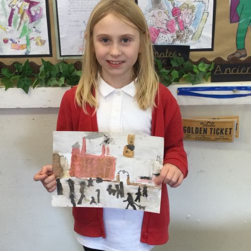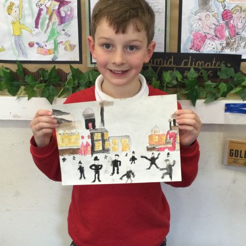 As part of our 'Chocolate' topic, we learn about the industrial revolution and the rise of factories in England. We studied the artist L.S. Lowry and replicated his paintings, considering carefully his 'match stick men' and his restricted colour pallet when creating his city landscapes. We are so proud of our pictures!