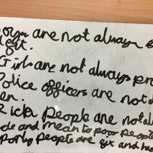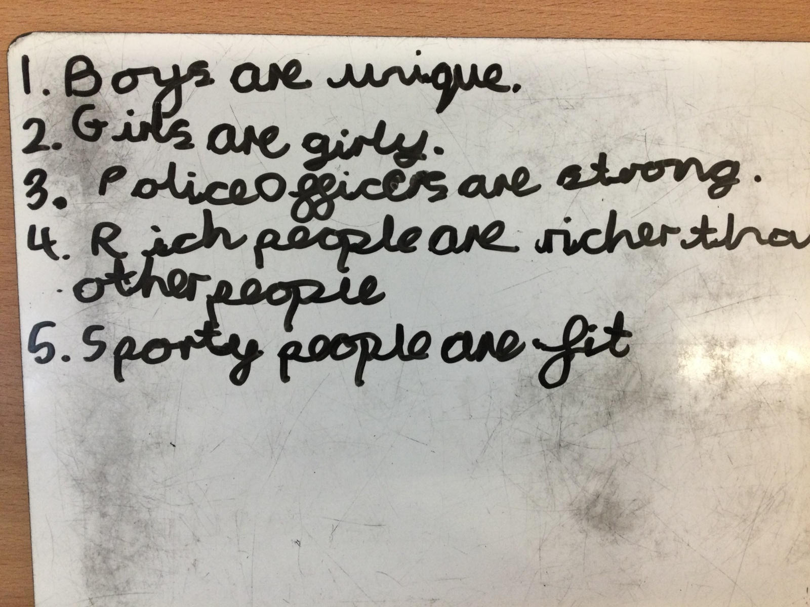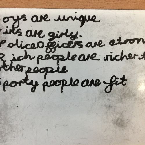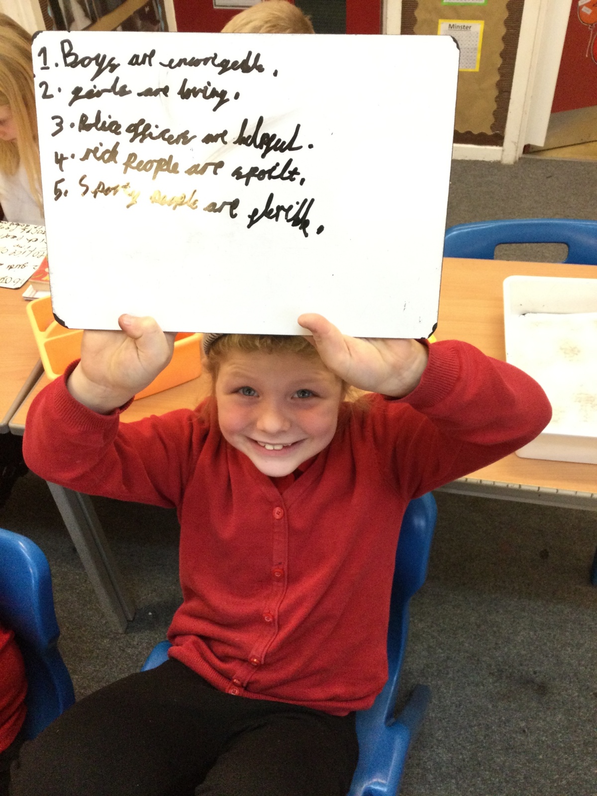 In PSHE, we discussed 'celebrating differences.' Initially, we wrote statements on whiteboards outlining what we thought boys were like and what we thought girls were like. We discussed the importance of not generalising boys and girls as everyone is different and not all boys and girls are the same. We also challenged our preconceived notions of what police officers, sporty people and rich people are like and we decided it is important not to make judgements about people before we get to know anything about them.